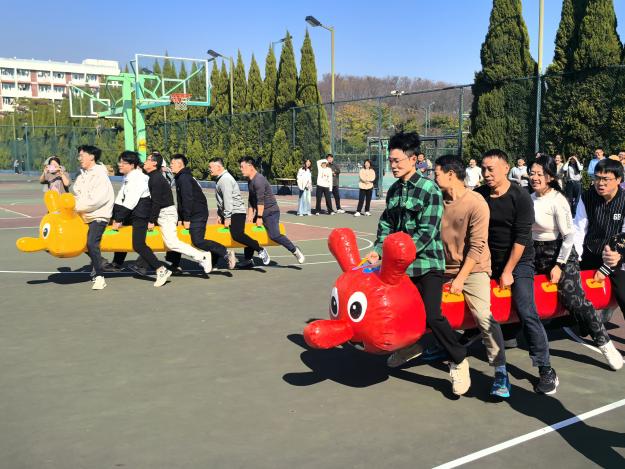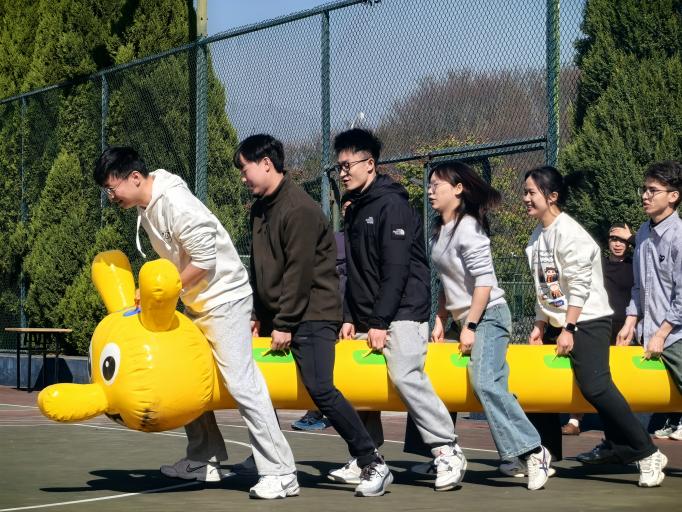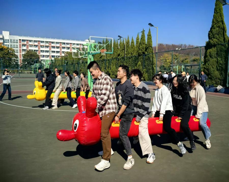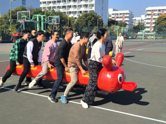 六人一组齐齐跨上充气“毛毛虫”,随着统一号令并肩出征——这堪称是最能点燃团队热血的协作试炼。“一二!一二!”呐喊声如战鼓擂动,在篮球场上交织碰撞,震得空气都仿佛在发烫。队员们屈膝蹬地时脚掌紧贴地面发力,前倾的身躯如蓄势的箭簇,眼神锁定同一方向,呼吸与步伐完美同频,双手紧扶“毛毛虫”两侧,用同步的节奏冲破阻力,每一步都带着破竹之势,将团队的同心协力化作直抵终点的磅礴动能。