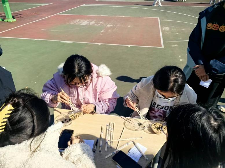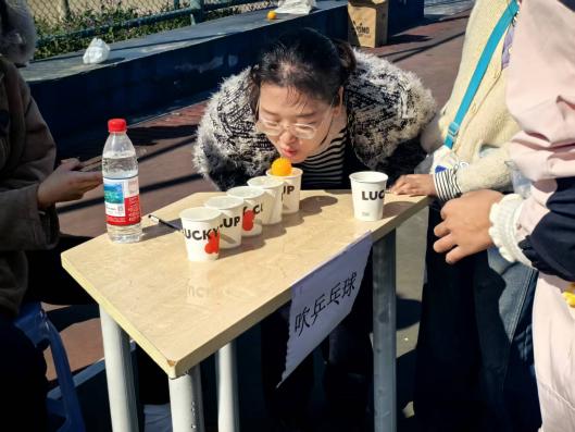 个人赛环节同样精彩纷呈。“趣味障碍投篮”中,选手们灵活穿越障碍、精准投篮;“吹乒乓球”项目则考验选手的肺活量与耐心,乒乓球在水杯间跳跃,引得观众阵阵喝彩;“豆你玩”项目中,同学们凝神静气,用筷子快速分拣豆子,展现了专注与细致的一面。