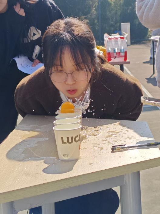 五只盛满清水的纸杯一字排开,白色乒乓球静卧杯口,静待选手的“气流指令”——这看似轻松的吹乒乓球项目,实则是力道与分寸的精准博弈。选手们屏息凝神,双眼紧盯球身,缓缓吐纳间找准发力节奏,用恰到好处的气流将球逐杯推送。稍有不慎,乒乓球便会坠入水中,一切只得从头再来,每一次平稳过渡都引来阵阵惊呼,尽显“四两拨千斤”的竞技智慧。