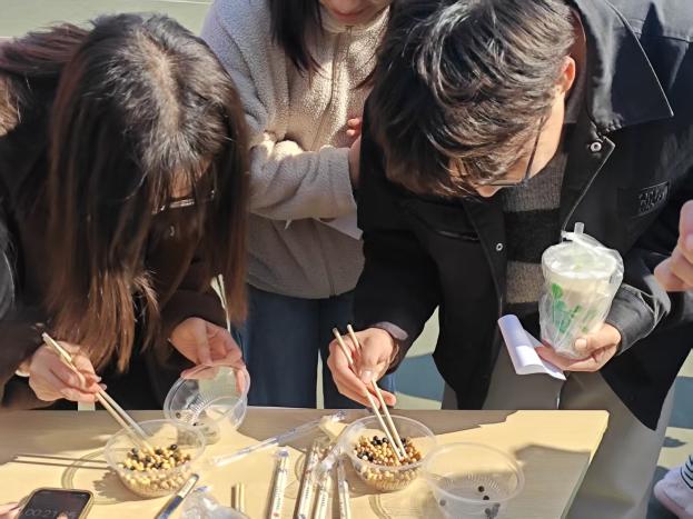 装满黄黑豆的瓷盘前,选手们手持竹筷严阵以待,一场“针尖对麦芒”的分拣大战即将开启——“豆”你玩项目既是速度的角逐,更是耐心与细致的较量。大家双眼紧盯盘面,手腕轻转、筷尖翻飞,以迅雷不及掩耳之势精准夹取黄豆,生怕错捡一颗黑豆打乱节奏。熟练的夹取动作里藏着超强专注力,每一次“筷起豆落”都牵动人心,尽显指尖竞技的无限趣味。